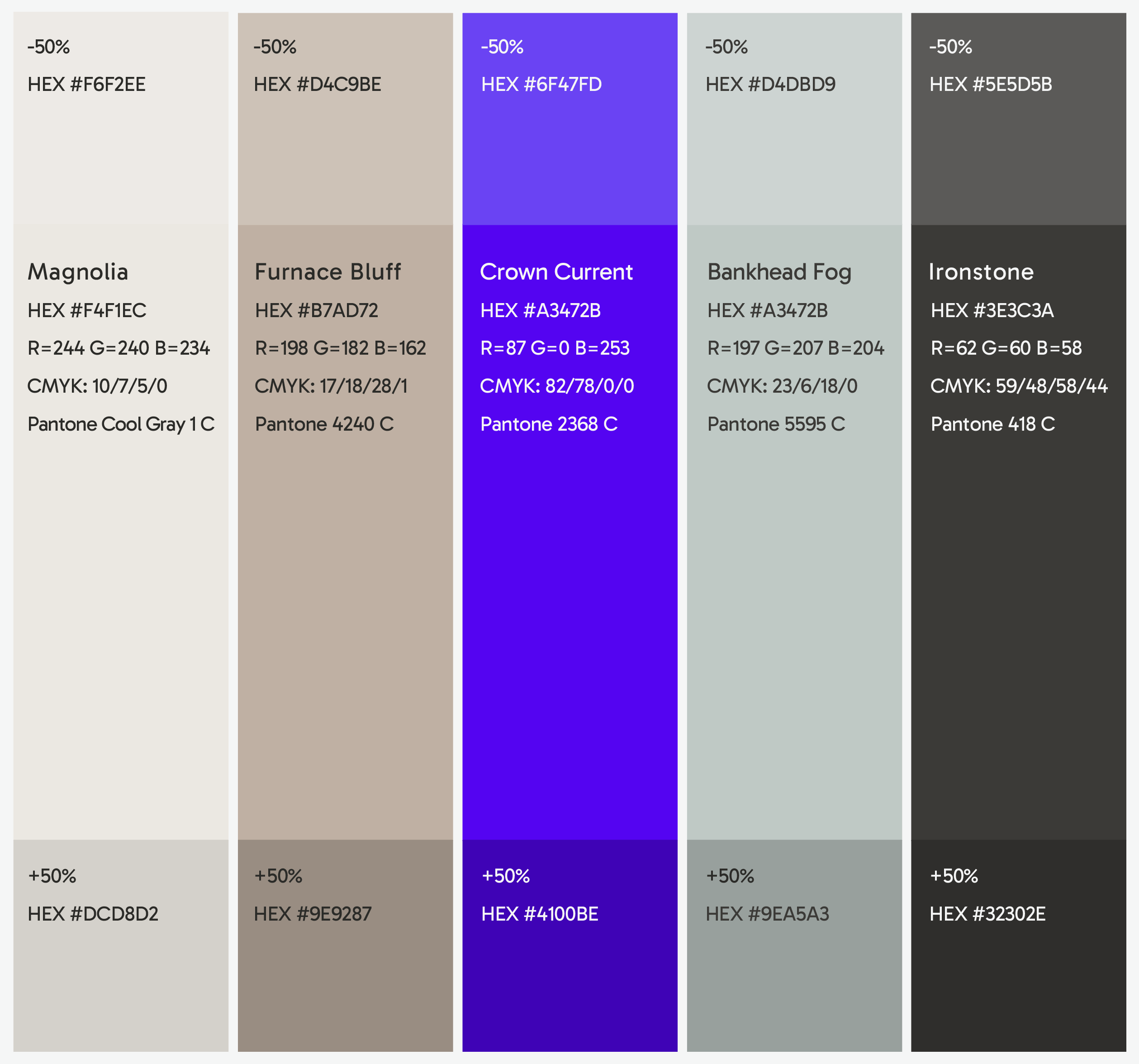 In this instance, the palette should be majority Magnolia, Ironstone, and Banhead Fog as your backgrounds—in that order. This allows us to use Furnace Bluff and Crown Current as deliberate pops that highlight key pieces of information or calls to action.